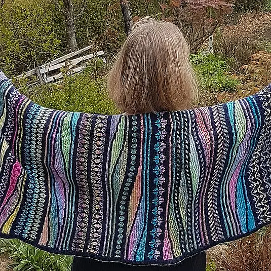 Die Stola wird mit Steek und Teilsteek gestrickt. Die Anleitung enthält Pattern und eine 'Reihe für Reihe-Anleitung' für den Swing-Teil